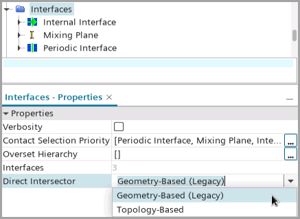 The selected option, together with the connectivity type of each individual interface, determines the properties available for the node, which is a physics value node available for all direct interfaces. In the connectivity type, you can activate the third type of direct intersector—Metrics-Based. When the Metrics-Based connectivity type is activated, it overwrites the direct intersector specification in the Interfaces node.