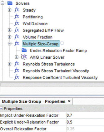 多尺寸组求解器默认的亚松弛设置可在一个速度情况下提供可靠的收敛。然而,具有高颗粒浓度的情况或每个尺寸组可以沿不同方向行进的多速度情况需要更多松弛。在这个模拟中,值分别为 0.7 和 0.5 比较合适。