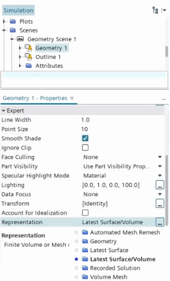 要更改当前表示,选择相关场景显示器节点(例如 ),然后在专家属性窗口中单击表示选项。下拉菜单中将列出当前可用的网格表示。