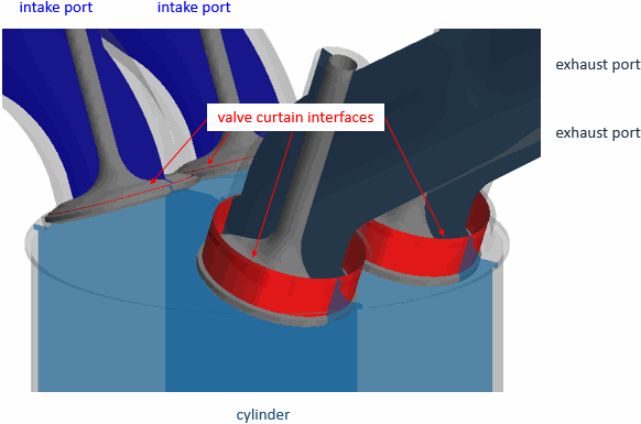 Simcenter STAR-CCM+ In-cylinder 使用阀门挡板交界面控制阀的打开和关闭。阀门挡板交界面是位于阀门面表面上的弯曲表面区域,它将气缸体积与相应的端口体积进行分离。