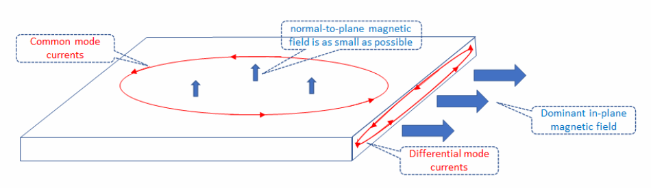 - 共模 - 平行于层压平面的平面中的电流环。它们是由设计良好的机器中通常很小的平面法向交替磁场生成的。