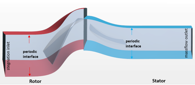 可压缩气流受滞止入口和质量流量出口约束。因为仅对空气压缩机的扇区建模,所以将上、下边界设为对称平面,并分别为转子和定子区域创建周期交界面。转子和定子之间的交界面是混合平面交界面。