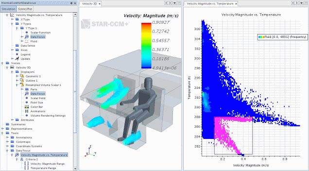 在 Simcenter STAR-CCM+ 中,数据聚焦方法是链接和刷新。设置绘图和场景后,选择绘图的一个或多个部分以定义相关条件。要可视化与条件匹配的数据,将绘图链接到场景。