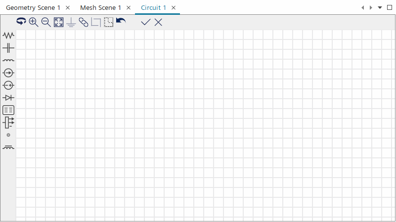 在打开的电路编辑器工作区中,可以在左侧的图标中找到电路元件。顶部栏上的图标显示旋转元件、放大、缩小和重置工作区等操作。