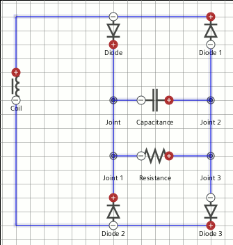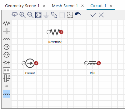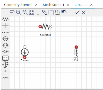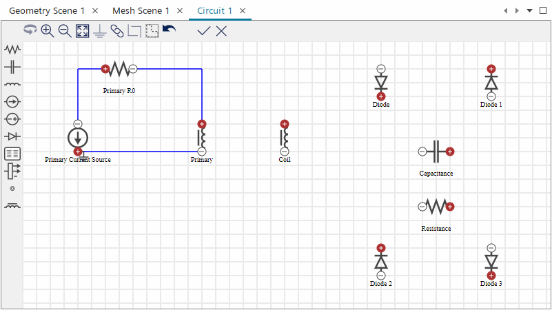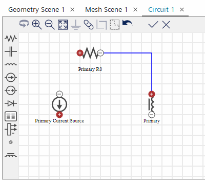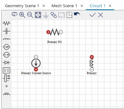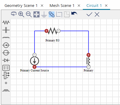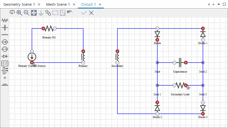 激活线圈物理连续体的电路模型后,Simcenter STAR-CCM+ 将在模拟树中添加电路节点。在此,可使用电路编辑器创建具有原回路和副回路的整流器电路。
