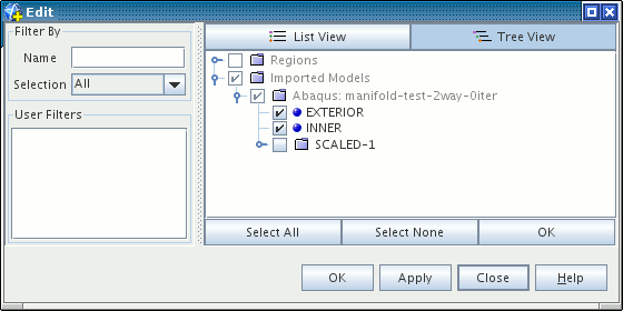 - 展开导入的模型节点并选择要显示的 CAE 模型单元(例如,以下屏幕截图中的 EXTERIOR(外部) 和 INNER(内部)),然后单击确定。
