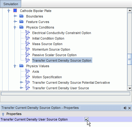 - 选择区域的物理条件文件夹中的转移电流密度源选项节点。