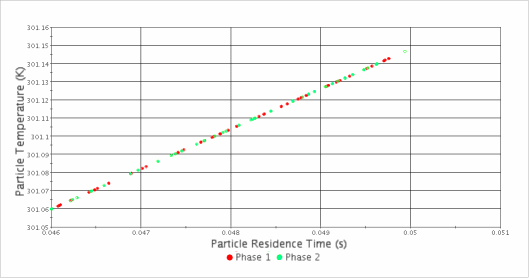 在上图中,相 1 对应于内部计算的粒子束热通量,相 2 对应于用户编码的粒子束热通量。 对于这种情况,由于颗粒时间在喷射过程中略微错开,因此停留时间稍有不同。 但是,在这两种情况下,颗粒温度与停留时间成线性比例。