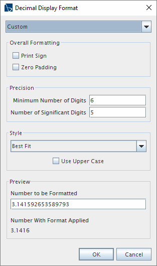 0.#######E00; Pi is displayed as3.1415927e00(converted to lower case). - Custom: the number of digits is determined by the specified custom settings. For example, if the Minimum Number of Digits is set to 6 and the Number of Significant Digits is set to 5, Pi is displayed as