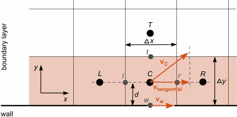 - 表示壁面处的值。、 和 分别表示近壁网格单元的左面、顶面和右面处的值。