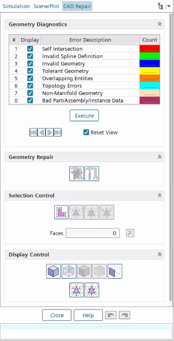 几何修复工具提供了一个用户界面以及可视化几何上的问题区域的方法。即使此工具无法修复特定问题,它也可以帮助标识几何上的问题区域。然后,可以返回到原生 CAD 软件包并解决标识的问题。