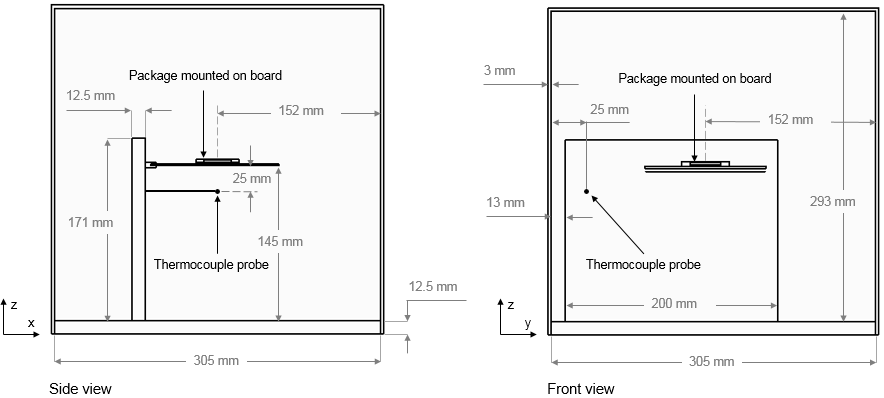 该模拟建立了集成电路在自然对流下的 JEDEC 标准测试方法模型 [957]。该测试方法目的是为了测试结面与环境交界处 ()芯片封装在标准静止空气环境中的热阻。 使得芯片封装之间的热性能比较可计算为: