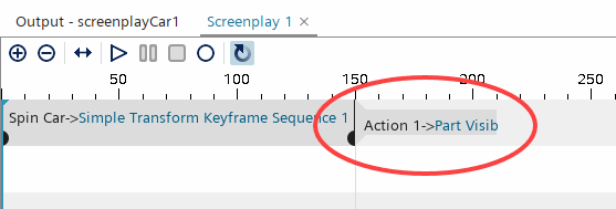 将零部件可见性属性拖放到动画剧本编辑器中的旋转汽车动作块之后。