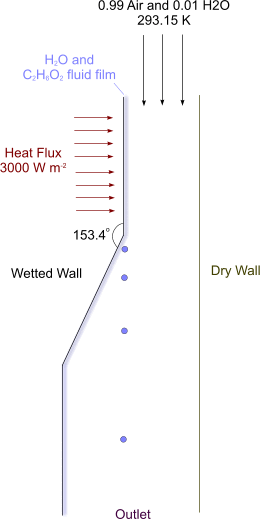 最初,液膜的温度为 293.15 K,覆盖的整理个厚度为 0.343 mm 的湿壁面。最初,周围的多成分气体均静止不动并由 99% 干空气和 1% 的水蒸气组成,温度为 293.15 K。这种情况使用隐式非稳态求解器运行 5.0 秒模拟时间来运行。时间步长已设为 0.01 秒。