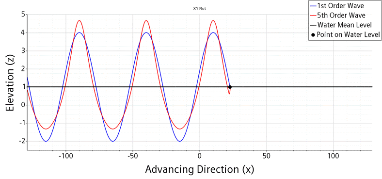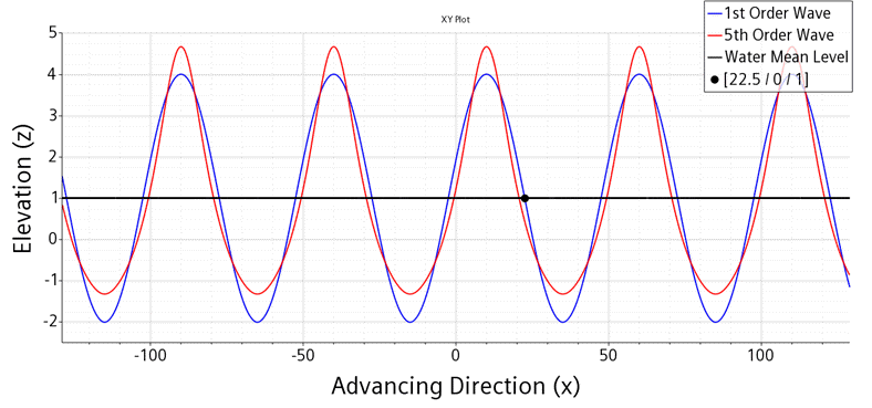 In the above example, the vertical direction is given by z and the advancing direction is given by the x-axis. The mean water level is at z = 1 m. The wavelength is 50 m and a wave peak is positioned at x = 10 m with a Point on Water Level = [22.5/0/1] m. This diagram shows the Point on Water Level is at the free surface for the first-order wave but not for the 5th order wave.