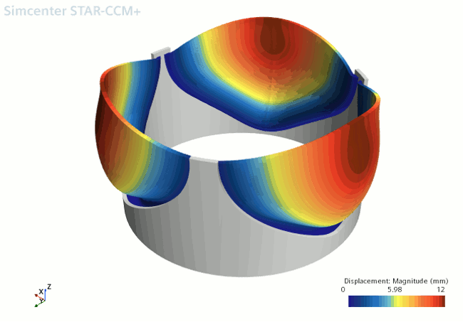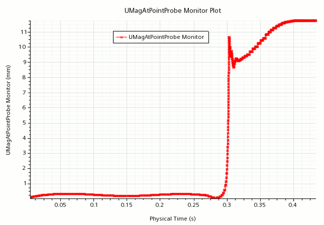 从位移幅值图中,可以看到首次施加负载时,叶瓣在压力负载下发生最小变形。在大约 0.29 秒(与时间步变化重合)时,叶瓣在极短的时间段(突跳事件)发生较大变形。此后,瓣膜在形成最大变形 11.75 mm 之前出现少量振荡。