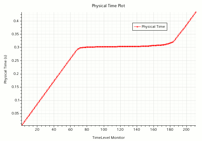 此绘图显示时间步如何随物理时间变化。时间级别对模拟中的时间步数计数。正如在模拟起点和终点的线性趋势中所见,时间步保持恒定。在模拟的这些部分,变形的变化率相似。在 0.29 s 和 0.31 s 之间,发生突跳事件时,必须减少时间步,才能捕捉快速变化的变形率。时间步减少会导致曲线展平。