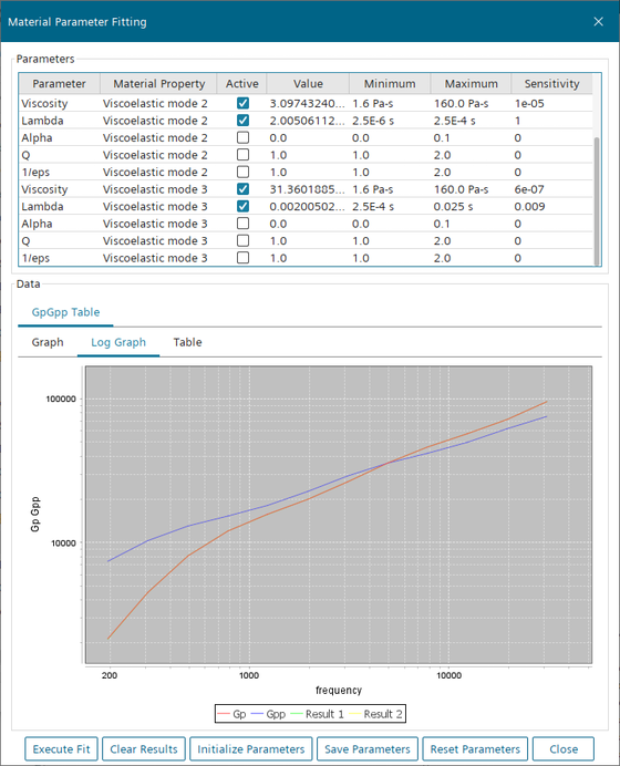 参数 材料属性 操作 粘度 粘弹性模式 2 单击活动,然后单击执行适配。 记下结果曲线,然后单击清除结果。