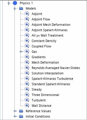已为此模拟中的流体物理选择 Spalart-Allmaras 湍流模型。由于模拟涉及流体流经翼板,这是 Spalart-Allmaras 模型的目标场景之一,因此在此处选择它是合理的。Simcenter STAR-CCM+ 可以求解此湍流模型的伴随。