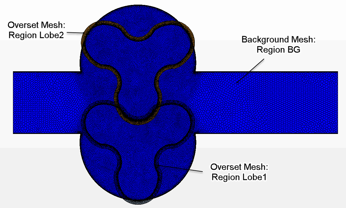 For this tutorial, you are provided with an input file that contains three meshes—one background mesh and two overset meshes. Inflow and outflow occurs through the background mesh. Each of the rotating lobes has an overset mesh. The meshes are available as regions with the individual boundary surfaces and boundary types defined.