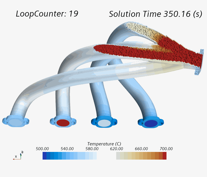 排气歧管的加热过程可以通过温度场景和之前步骤中创建的绘图可视化。