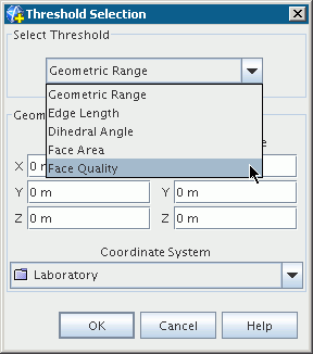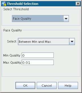 使用面网格质量阈值时,在阈值选择对话框中指定最低面网格质量和最高面网格质量。