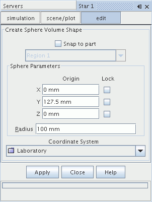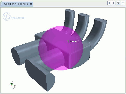 要定义球体,使用全局笛卡尔坐标系或局部坐标系指定球体的原点和半径。 使用点工具时,可通过将球拖到适当的位置以图形方式选择原点,也可以将坐标直接输入到对话框中。 注意,可通过输入半径值并按 Enter 键查看球体的表示。 按创建按钮可在体形状节点下创建名为 Sphere 1(球体 1) 的新节点。 可根据需要重复此过程任意次,以创建更多球体形状。 按关闭按钮可完成该操作。