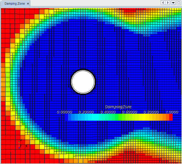 在此示例中,有一个从左到右的强大气流,通过来自圆柱体的涡流脱落生成声波。 相关区域(蓝色)无阻尼,其他任意地方为全阻尼(红色)。 请注意整个非阻尼区的精细网格和网格转换时应用的阻尼。