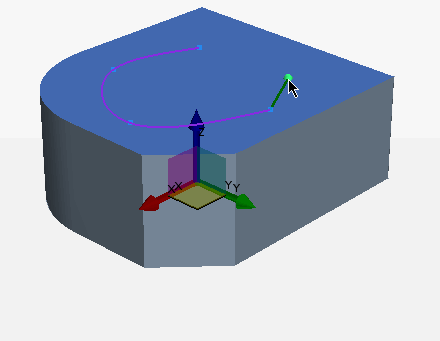 绘制一条约束到 CAD 表面的样条曲线。要在面上绘制一条样条曲线,需要至少单击鼠标三次。每次会将样条曲线限制到一个面上。在表面上移动鼠标指针时,表面会以蓝色高亮显示,以表示会将样条曲线约束到其中。在边上移动鼠标指针时,这些边会以黄色高亮显示。![]() |