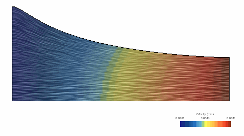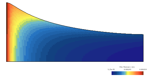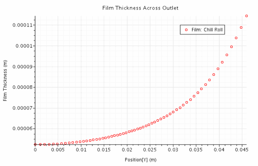 - 模具出口处与流入边界对应的恒定初始液膜厚度为 0.46 mm,在拉伸方向连续减少。液膜厚度在液膜上不保持恒定,而是假设分布。理想情况下,您希望在拉伸时实现均匀分布。在流出边界处的中心线处达到最小值 0.052345 mm。