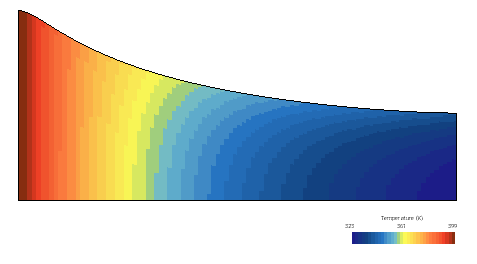 液膜进入域,温度为 400 K。退出域时,液膜将在拉伸方向逐渐冷却,以达到中心线的最小值。流出边界对应于冷却辊。