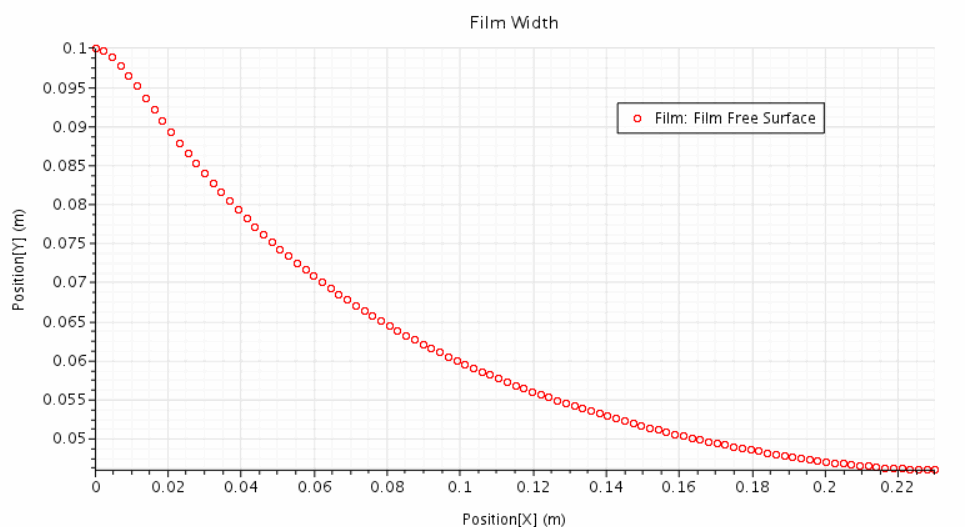 从模具出口处的初始宽度为 0.1 m,从中心线开始测量,液膜宽度减小到值 0.046 m。