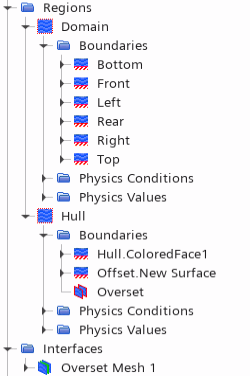 - The simulation includes two fluid regions — one for the main fluid domain (Fluid) and an overset region for the fluid around the hull (Hull). The main fluid domain is 1300 m by 1000 m by 400 m. This provides a domain around three wavelengths long, which is the recommended domain size for a simulation that uses wave forcing.