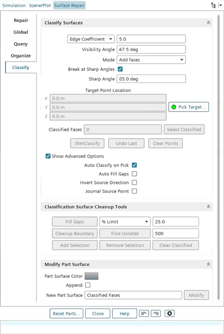 In Surface Repair, you can Classify faces based on specified settings and create corresponding part surfaces. You can influence the classification process using the settings in the Classify tab.