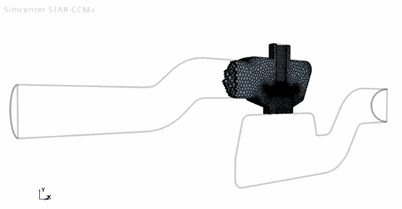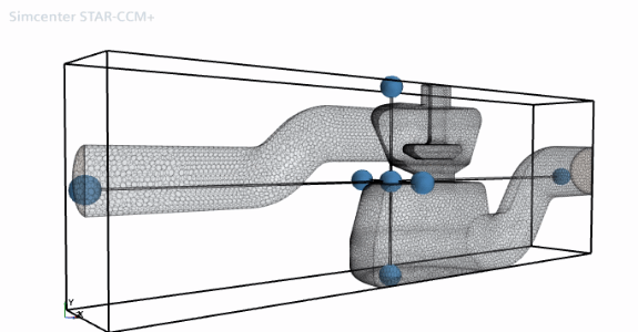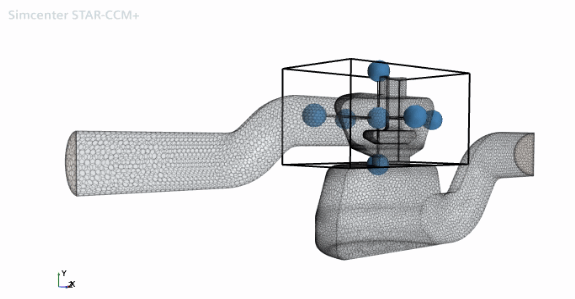 单击并拖动球,沿每个方向延伸或缩小框尺寸。右键单击并垂直拖动框,可以同时调整所有框的坐标。使用鼠标中键单击框,可沿每个方向平移。以下示例显示了模型的阀区域附近缩小的框尺寸: