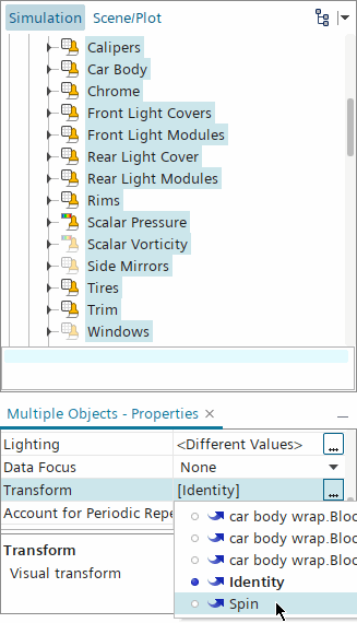 第一个动画操作可使汽车旋转,以从各种角度查看标量数据。简单的变换即可实现旋转。