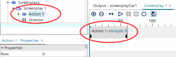 将显示包含关键帧序列的操作节点 Action 1。此节点对应于剧本编辑器中的动作块。