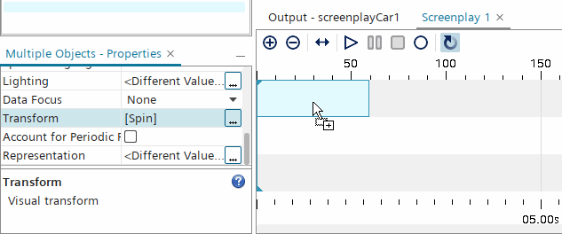 在剧本编辑器中,单击 Spin Car 块中的关键帧序列