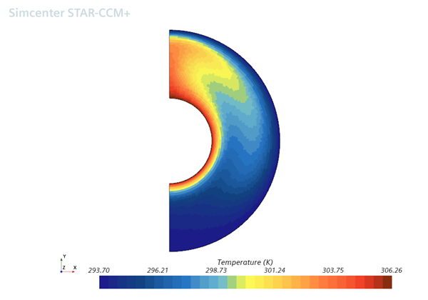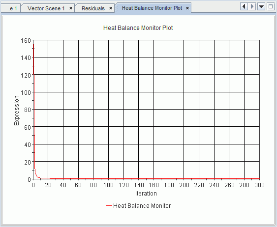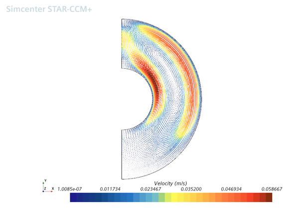 可视化结果 标量和矢量场景包含求解结果。正如预料的那样,温度将在内圆柱体壁面和外圆柱体壁面之间降低。这种降低对应于两个圆柱体固定壁面温度之差。较热的空气随着它从内圆柱体壁面向外圆柱体移动而上升,然后随着它的冷却下沉到环带底部。空气由于自然对流而在环带内再循环,在圆柱体的壁面附近达到最大速度,向顶部移动。 在屏幕中查看这些结果。 热平衡快速下降到大约为零,表明问题正确收敛。