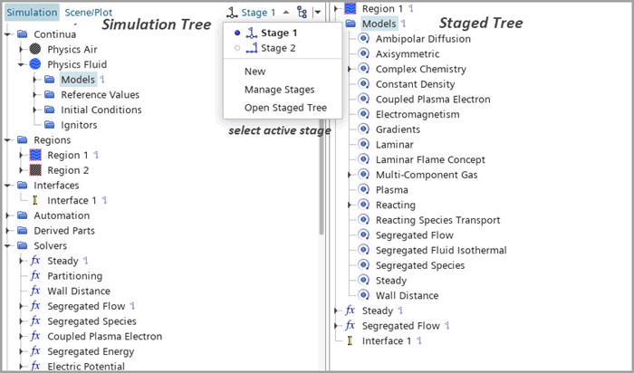 For each staged physics setting, you see marked flags next to the object in the simulation tree. To enable the quick access of staged objects in the active stage, Simcenter STAR-CCM+ provides a read-only staged tree, where the object icons are linked to the simulation: