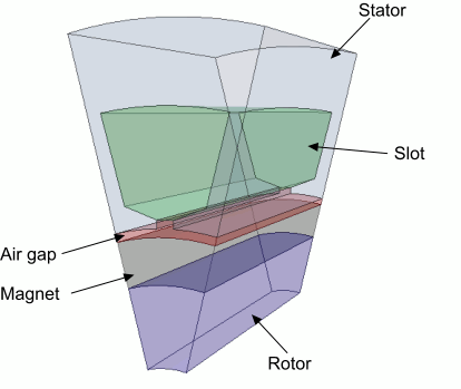 在本教程中,为您提供了电机的一个截面,包含五个零部件:转子 (rotor)、磁体 (magnet)、气隙 (air gap)、槽 (slot) 和定子 (stator)。这些零部件全都连接在一起,并且具有规则截面轮廓,从而使此几何成为使用定向网格化的很好案例。
