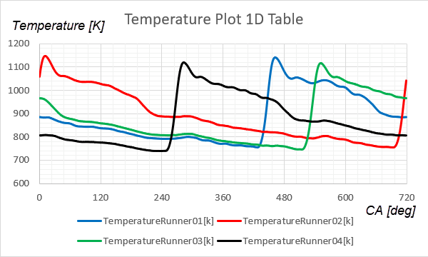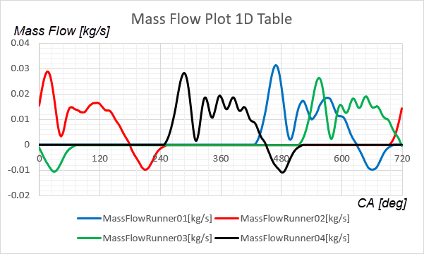 本教程中的排气歧管是四冲程四缸发动机的一部分。在一次发动机循环中,曲轴完成两次旋转(720 度)。通过排气流道的质量流量和温度以及歧管出口的压力是与时间相关的(曲柄角度相关)物理量。这些物理量取自 1D 发动机机体模拟的一次发动机循环。