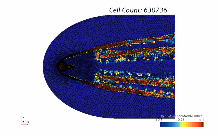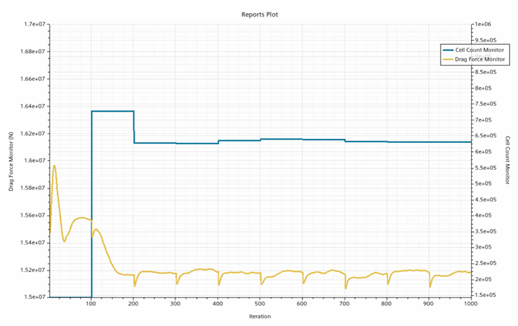 这里可设置停止条件并运行模拟。如 AMR 求解器设置中所定义,网格每 100 次迭代即会调整一次。
