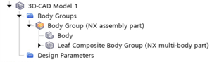 The 3D-CAD environment launches and a 3D-CAD model is created. Within 3D-CAD, an object tree that is specific to the 3D-CAD model is displayed. This tree contains Body Groups, Features, Design Filters, and Design Parameters nodes.