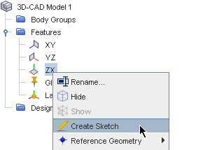 | 注 | 右键单击某个特征节点将显示与该特定特征相关的弹出菜单。某些操作对大多数特征通用,而其他操作则更为特定。 |