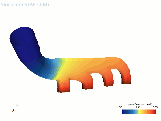 可视化已导入的温度 可视化标量场景已导入的温度数据。导入温度数据期间,Simcenter STAR-CCM+ 已创建名为导入的温度的场函数。使用导入的温度场函数可视化温度数据: 创建新标量场景。 将标量场景 1 节点重命名为导入的温度。 编辑轮廓 1 > 零部件节点。 在零部件对话框中,取消选择区域节点,然后单击确定。 展开标量 1 节点,然后设置下列属性: 节点 属性 设置 零部件 零部件 导入的模型 > Abaqus:排气 > 导入的表面 > INNER 标量场 函数 导入的温度