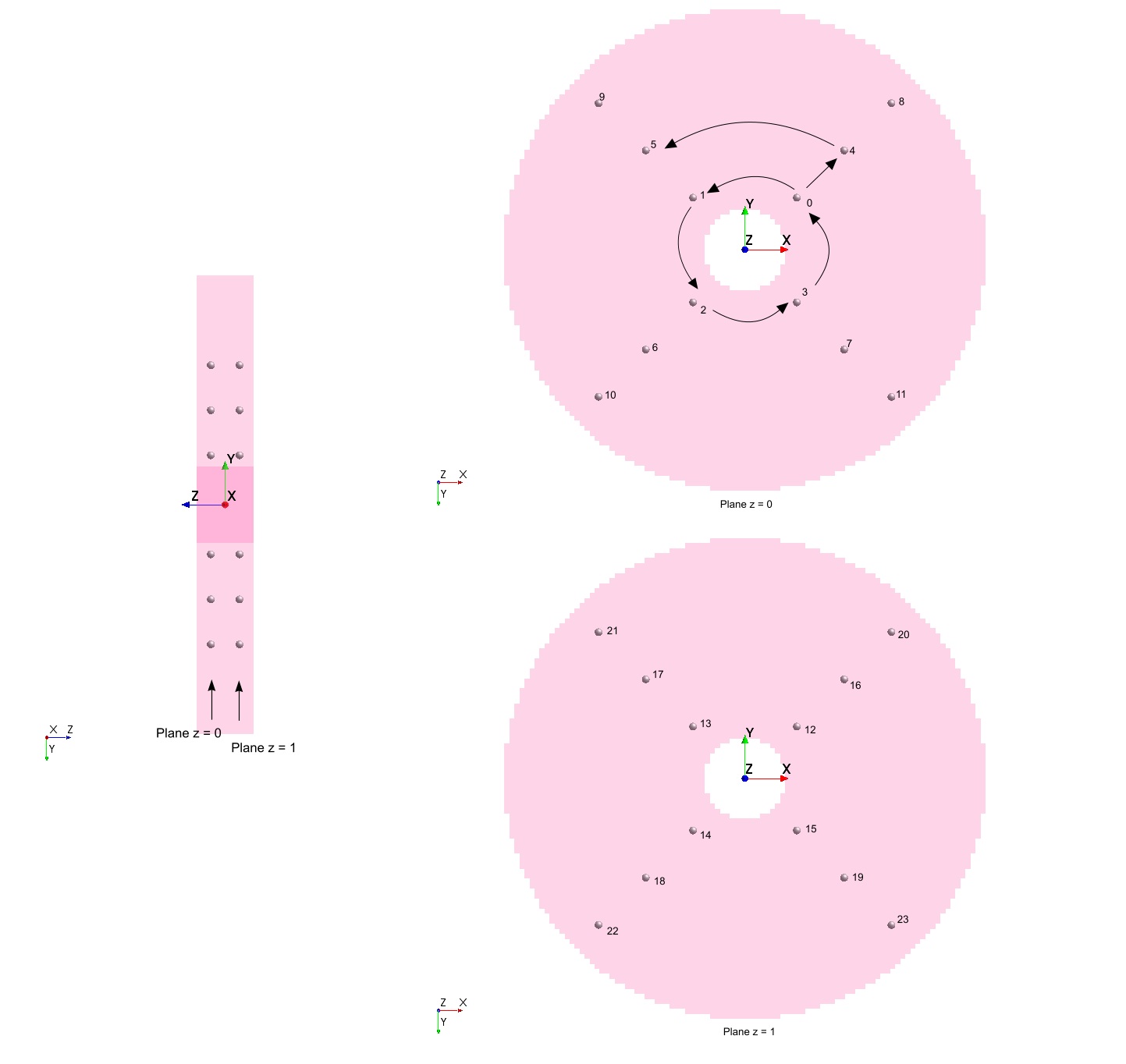 根据用户指定的分辨率 (nx, ntheta, nz),可通过 n = nx * ntheta * nz 得出容器总数。其中,nx 是径向上的网格单元数,ntheta 是方位角方向上的网格单元数,nz 是盘体法向上的网格单元数。容器按如下所示一维顺序排列:bucket(0), bucket(1), bucket(2),..., bucket(n-1)。圆柱盘体网格上的点与容器 ID 之间的映射取决于以下循环顺序: