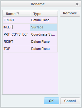 重命名对话框中将新增一个条目。 如果该面与现有条目对应,则其名称将高亮显示。