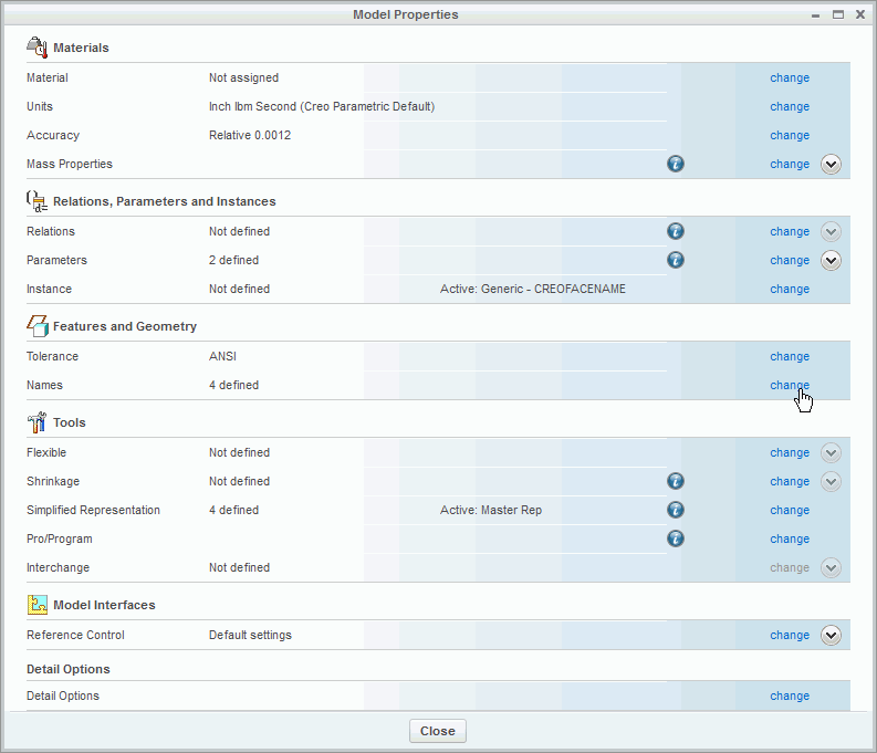 在 Model Properties(模型属性) 对话框中,找到 Features and Geometry(特征和几何) 组合框,然后单击名称属性旁的 change(更改)。