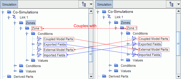 可以定义多个协同仿真区域,以指定不同的耦合模型部件组上的不同条件。每个区域均会使用索引加以标识,并连接到与合作伙伴仿真中定义的索引相同的区域。模拟中定义的协同仿真区域数量必须与合作伙伴仿真中的区域数量相匹配。